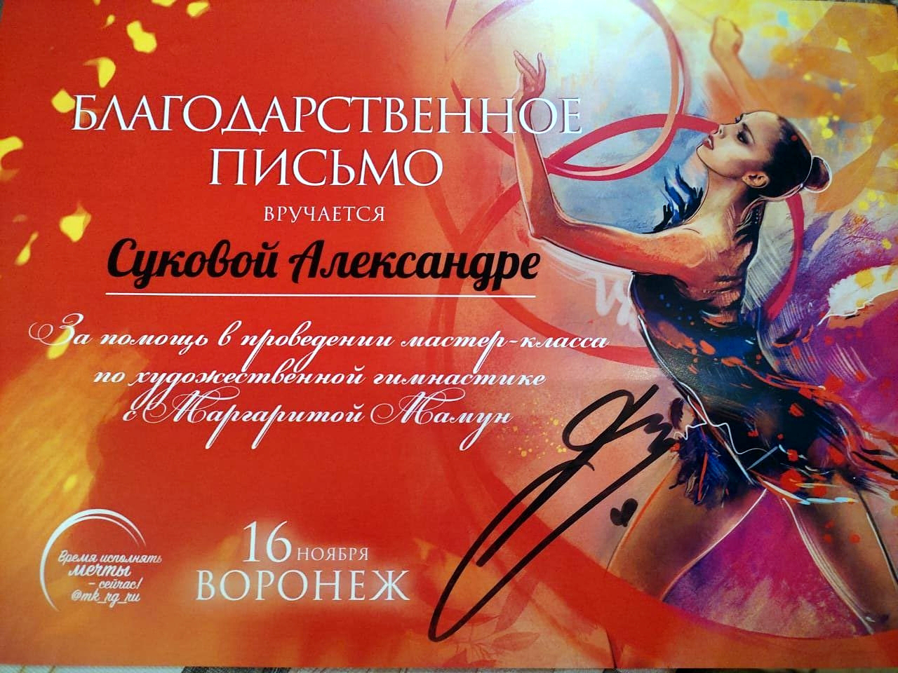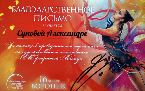 Студентка ФСПО Сукова Александра получила благодарственное письмо за помощь в организации мастер-класса олимпийской чемпионки, семикратной чемпионки мира, четырёхкратной чемпионки Европы, заслуженного мастера спорта России по художественной гимнастике Маргариты Мамун.