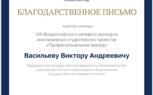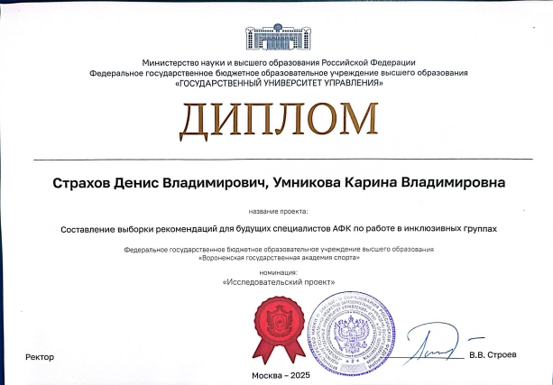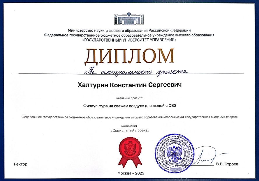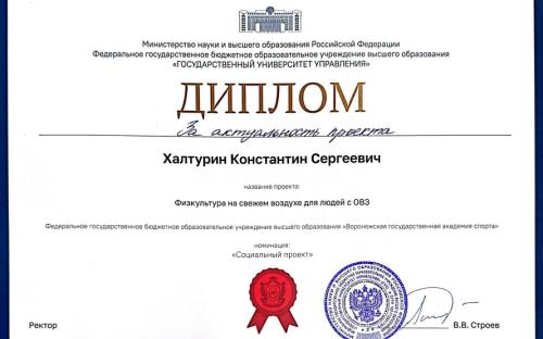 ВГАС на конкурсе представляли: студент 1 курса 4 группы - Халтурин Константин с проектом «Физкультура на свежем воздухе для людей с ОВЗ» и студенты 2 курса 6 группы - Страхов Денис, Умникова Карина с совместным проектом «Составление выборки рекомендаций для будущих специалистов АФК по работе в инклюзивных группах». Проекты ребят были отмечены дипломами.