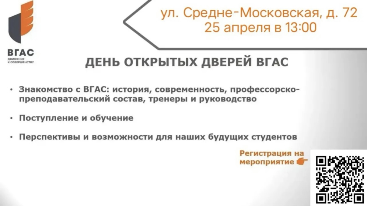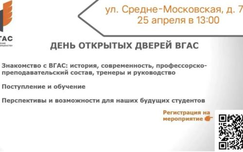 Воронежская государственная академия спорта приглашает Вас на зрелищное мероприятие: "День открытых дверей ВГАС" — уникальную возможность познакомиться с ведущим спортивным вузом региона, узнать о программах обучения и задать вопросы напрямую представителям академии.