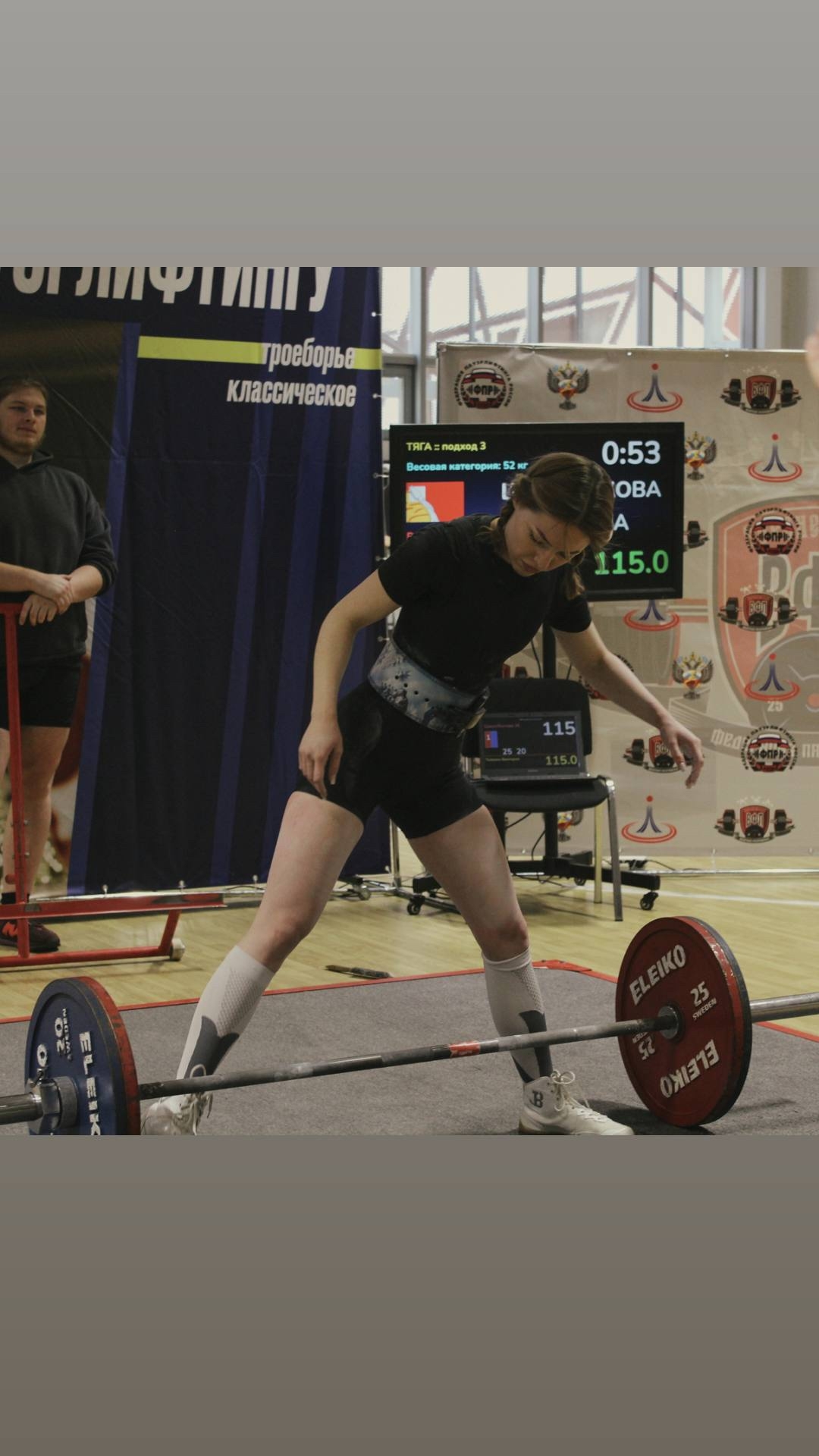 - Студентка 4 курса тренерского факультета Дарья Черных дебютирует в троеборье в весовой до 57 кг с приседаниями 80, жимом 37,5, тягой 87,5 выполняет норматив 1 разряда;